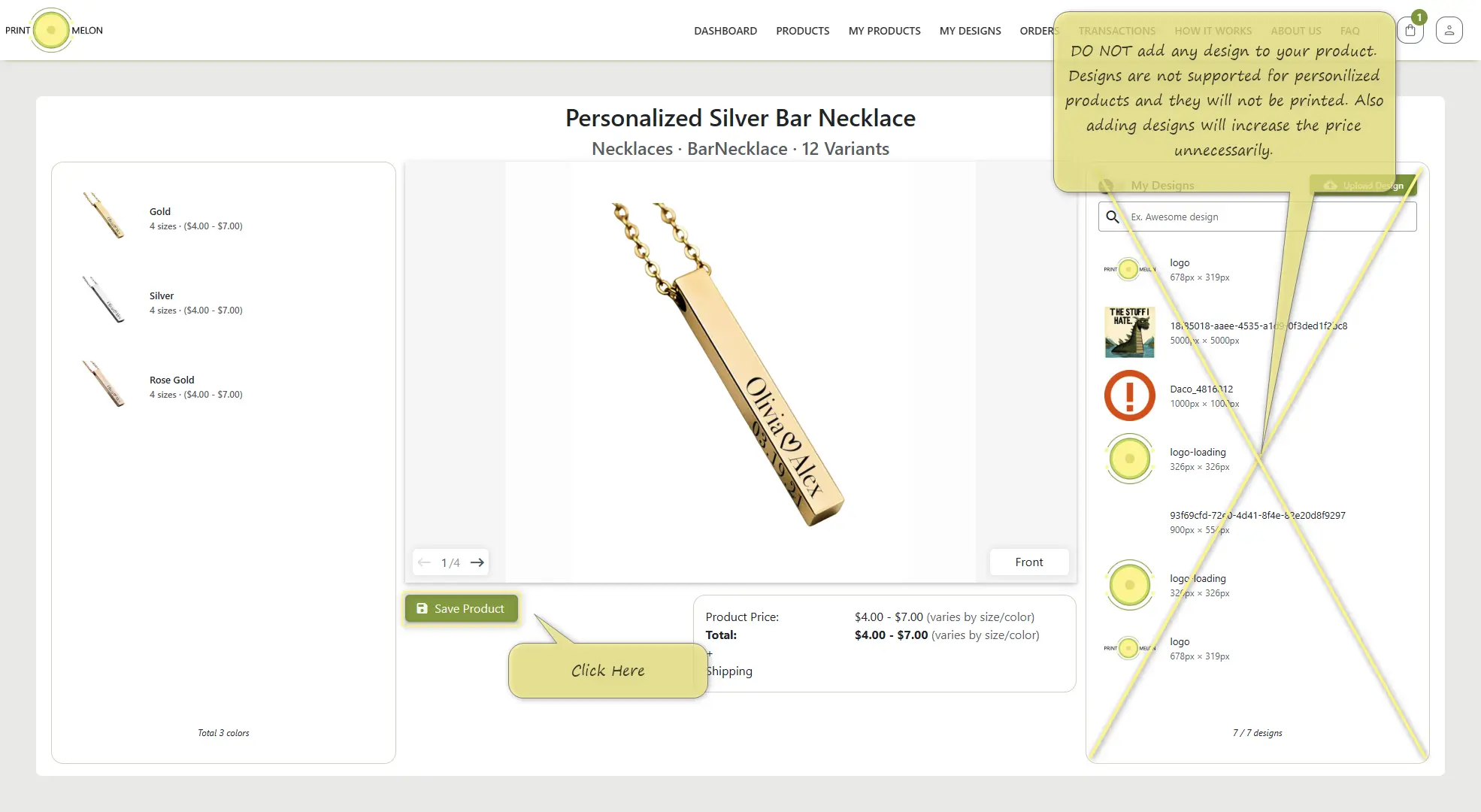 Do not add any design to your products at this step. The designs you have added will NOT be printed and will unnecessarily increase your product prices.