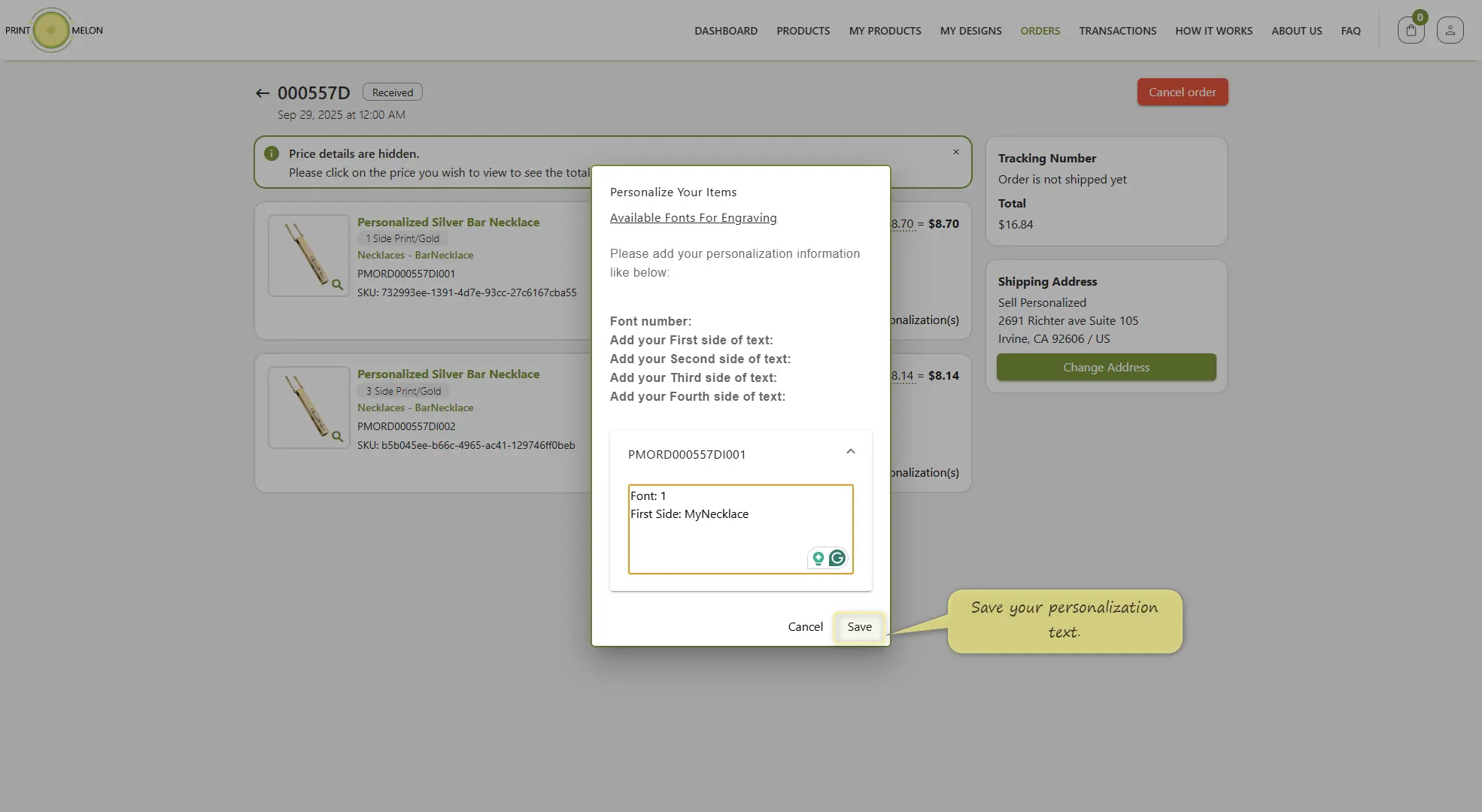 Add your personalization text according to instructions and save it.